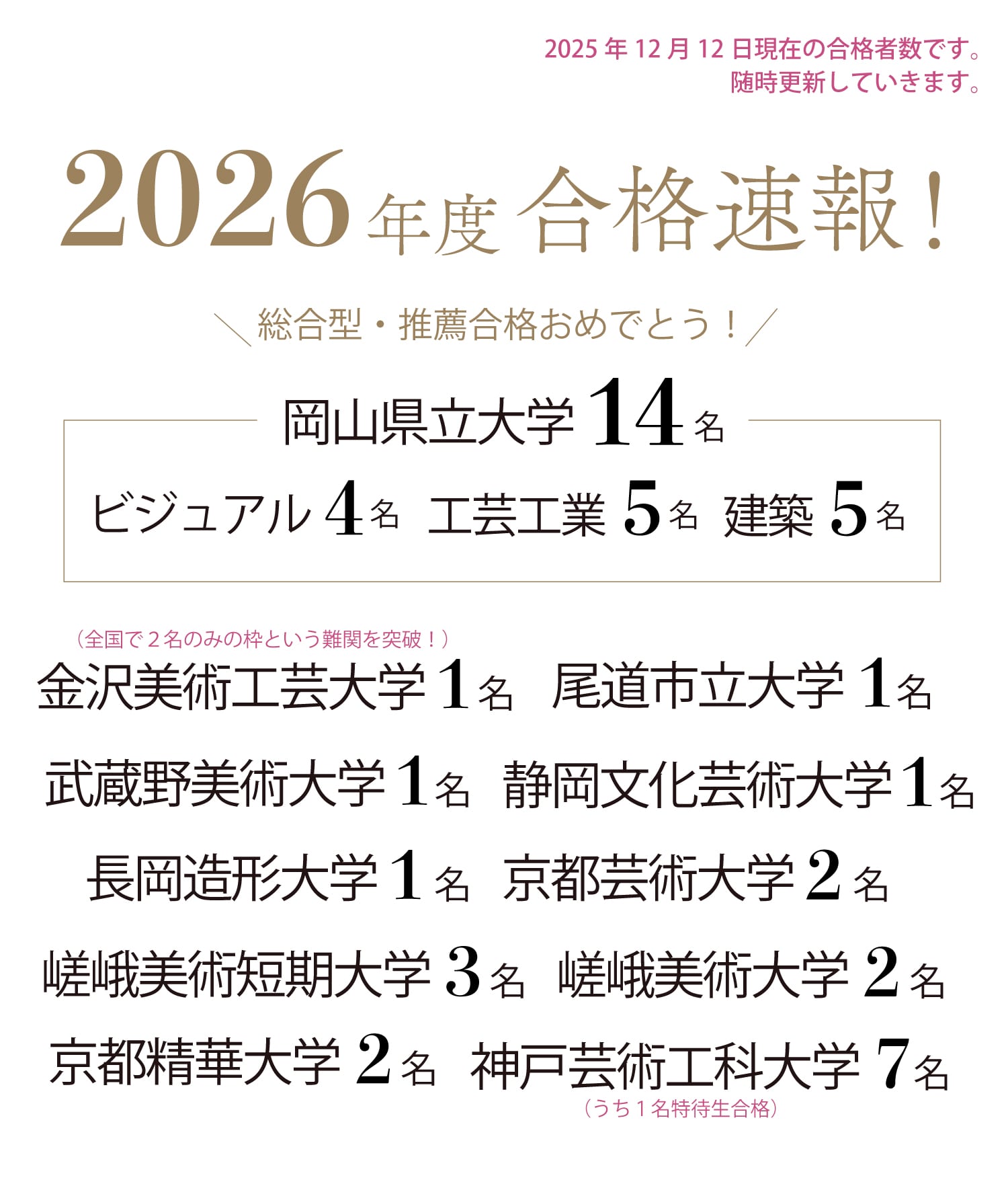 武蔵野美術大学 視覚伝達デザイン学科 合格4名!武蔵野美術大学 工芸工業デザイン学科 合格4名!武蔵野美術大学 空間演出デザイン学科 合格4名!武蔵野美術大学 基礎デザイン学科 合格4名!武蔵野美術大学 芸術文化学科 合格2名!武蔵野美術大学 デザイン情報学科 合格3名!武蔵野美術大学 油絵学科 合格1名!多摩美術大学 グラフィックデザイン学科 合格1名!多摩美術大学 プロダクトデザイン学科 合格2名!多摩美術大学 環境デザイン学科 合格1名!多摩美術大学 情報デザイン学科 メディア芸術コース 合格1名!多摩美術大学 芸術学科 合格2名!多摩美術大学 統合デザイン学科 合格3名!東京造形大学 グラフィックデザイン専攻領域 合格1名!東京造形大学 映画・映像専攻領域 合格1名!東京造形大学 アニメーション専攻領域 合格1名!東京造形大学 メディアデザイン専攻領域 合格2名!東京造形大学 インダストリアルデザイン専攻領域 合格1名!東京造形大学 室内建築専攻領域 合格1名!東京造形大学 テキスタイルデザイン専攻領域 合格1名!金沢美術工芸大学 製品デザイン専攻 現役1名! 2年連続100%合格!!富山大学 芸術文化学部 合格1名!公立 静岡文化芸術大学 デザイン学部 合格3名!公立 長岡造形大学 建築・環境デザイン学科 合格1名!岡山県立大学 ビジュアル・工芸工業デザイン9名!岡山県立大学 建築学科5名 合格!京都芸術大学 プロダクトデザイン学科 プロダクトデザインコース 合格1名!京都精華大学 イラスト学科 イラストコース 合格1名!京都精華大学 プロダクトデザイン学科 ファッション 合格1名!京都精華大学 日本画専攻 合格1名!京都精華大学 ビジュアルデザイン学科 グラフィックデザイン 合格1名!京都精華大学 マンガ学部 カートゥーンコース 推薦合格1名!神戸芸術工科大学 ビジュアルデザインコース 合格1名!嵯峨美術大学 芸術学部 造形学科 日本画専攻 合格1名!嵯峨美術大学 芸術学部 デザイン学科 キャラクターデザイン 合格1名!倉敷芸術科学大学 芸術学部 デザイン芸術学科 合格1名!総社南高等学校 美術工芸系 合格6名!岡山工業高等学校 デザイン科 合格3名!高梁城南高等学校 デザイン科 合格1名!明誠学院高等学校 特別芸術コース 合格3名!