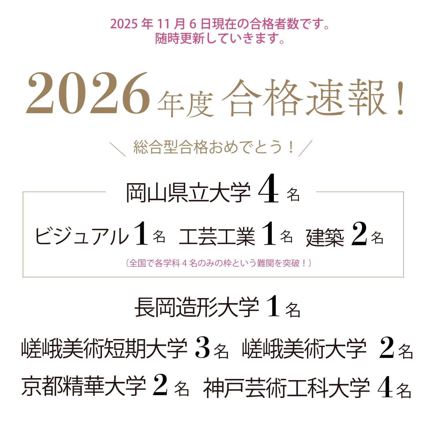 岡山県内の大学・高校をはじめ県外の大学へも多数の合格者を輩出!