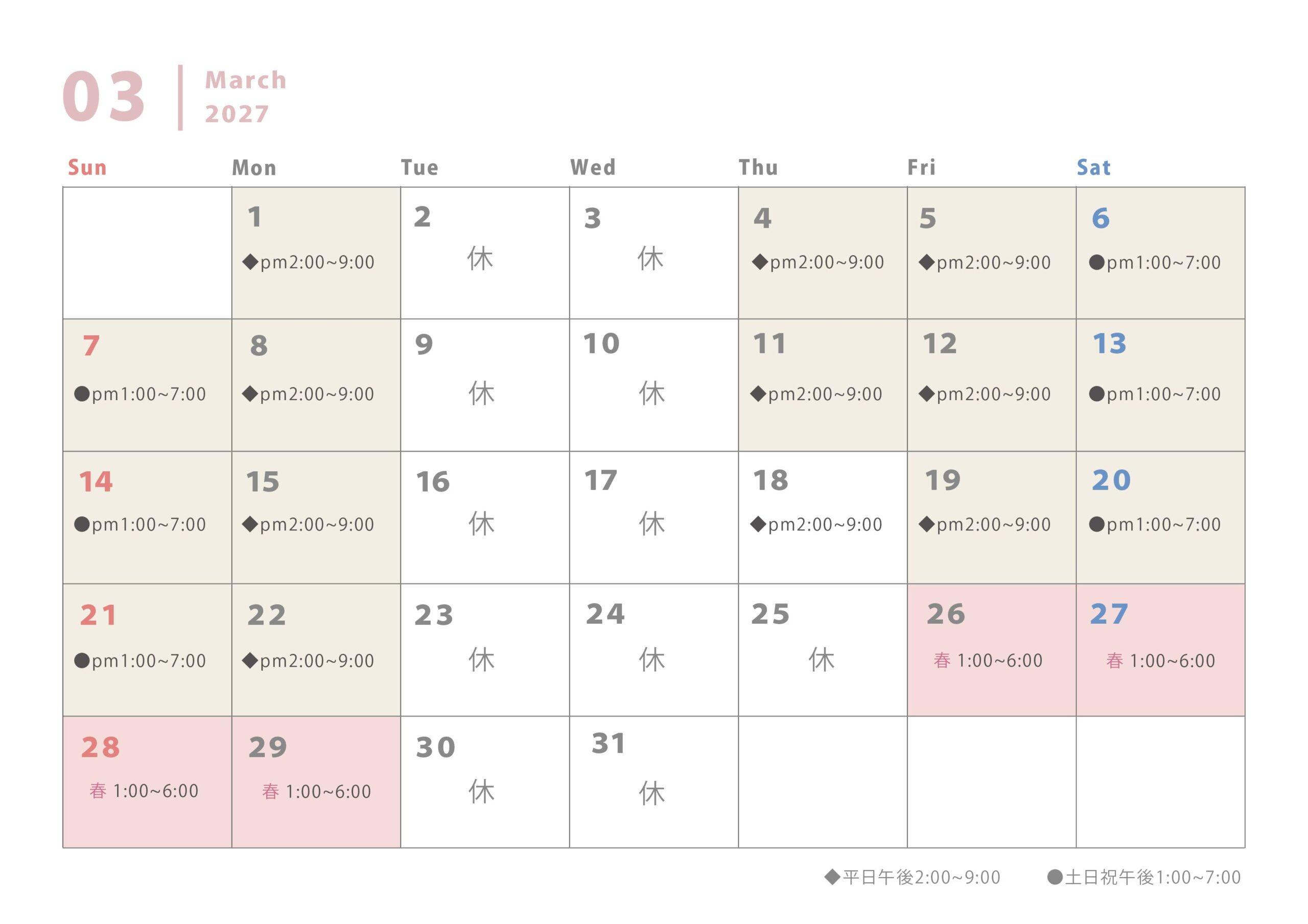 平日14〜21時、土日祝13〜19時