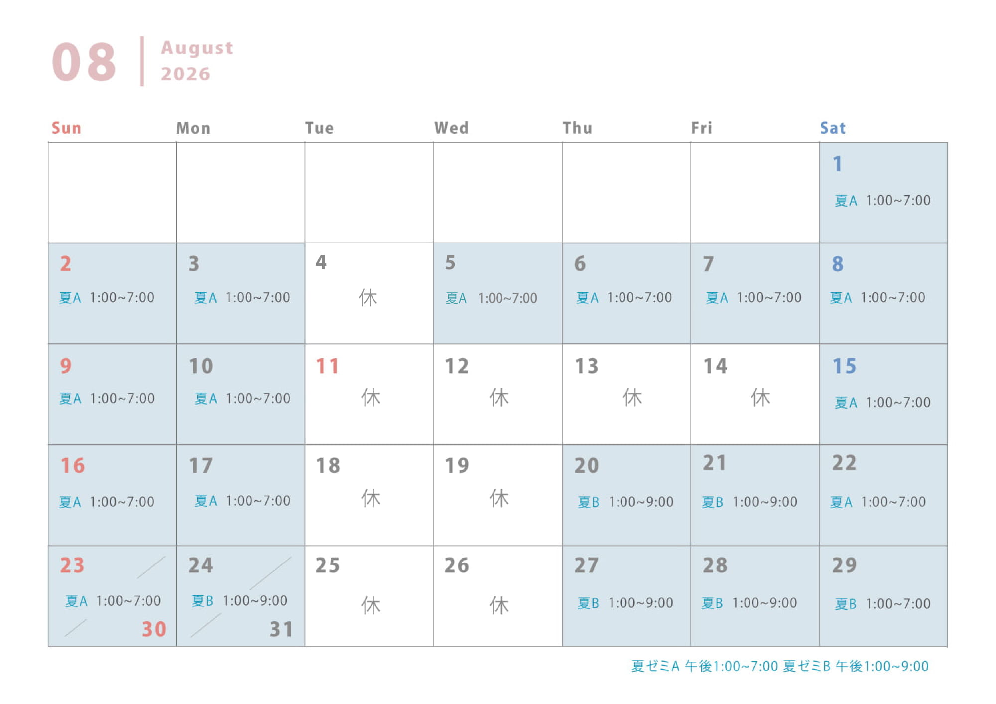 夏ゼミ期間:A 13〜19時:B 13〜21時