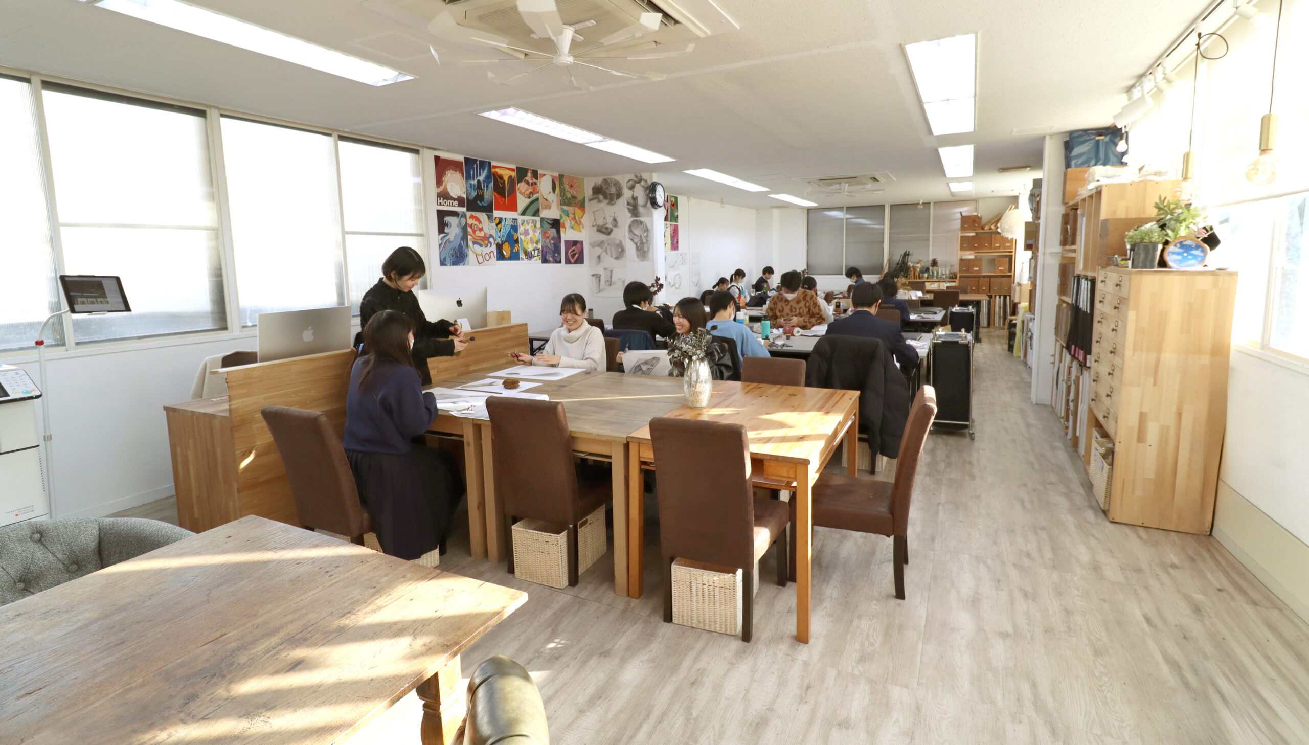 グランガルルは現役プロデザイナーによる指導が特徴の美大受験予備校です。将来デザイナーになりたい!という明確な目標がある方も、絵を描くのが好きだけど才能をどう将来に結びつけたらいいか分からない…という進路に悩んでいる方にもオススメです。在校生は学校の課題や勉強をする場としても自由にご利用いただけます。アトリエ内はフリーWifiも完備。