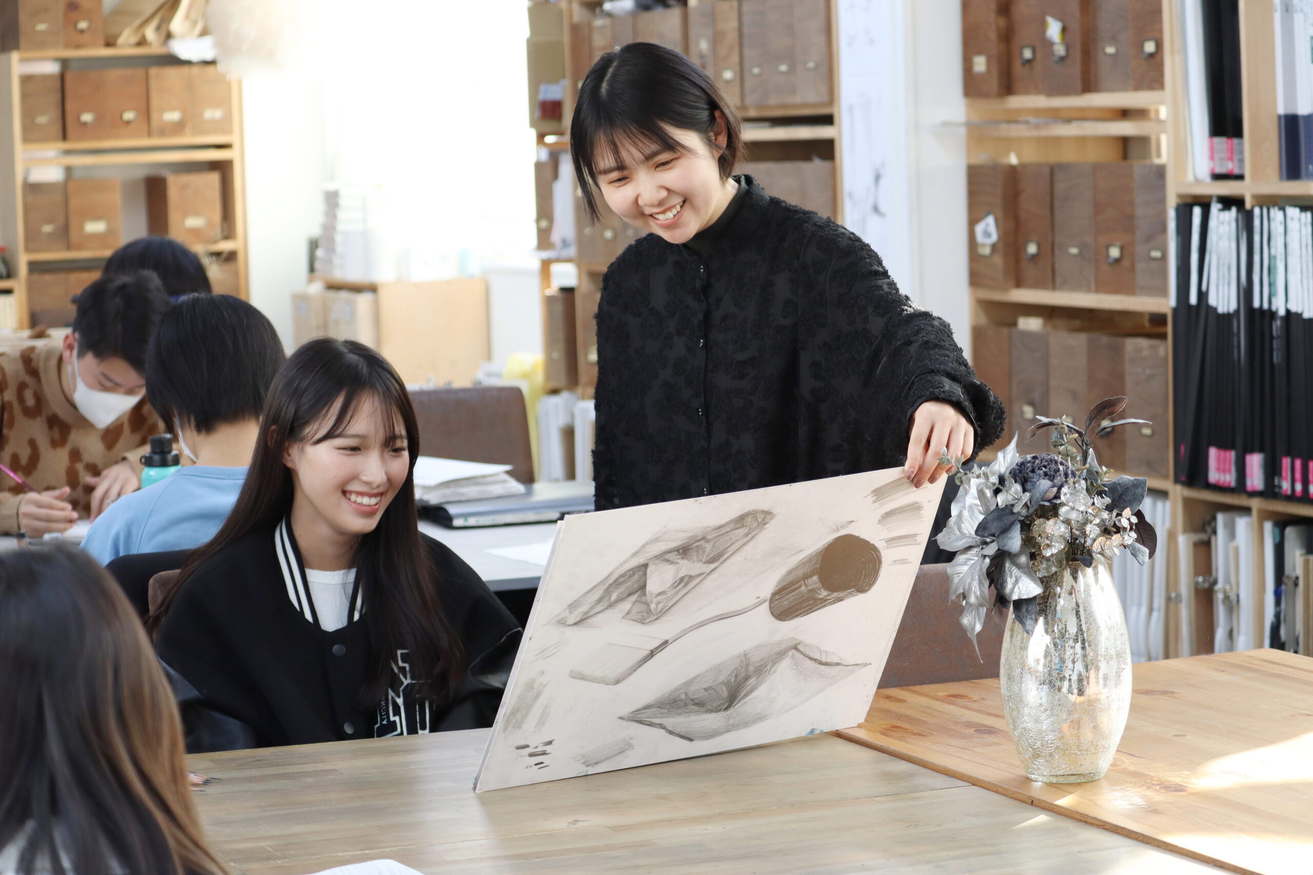 実はデザイン系学部に進学後は、デッサンをしたり絵画作品に取り組む時間はほとんどありません。4年間、各研究室が企画、ブランディング、プレゼンテーションをはじめとした、それぞれの分野における「プロ」を養成するための徹底した指導を行い、就職までの道のりをサポートしています。