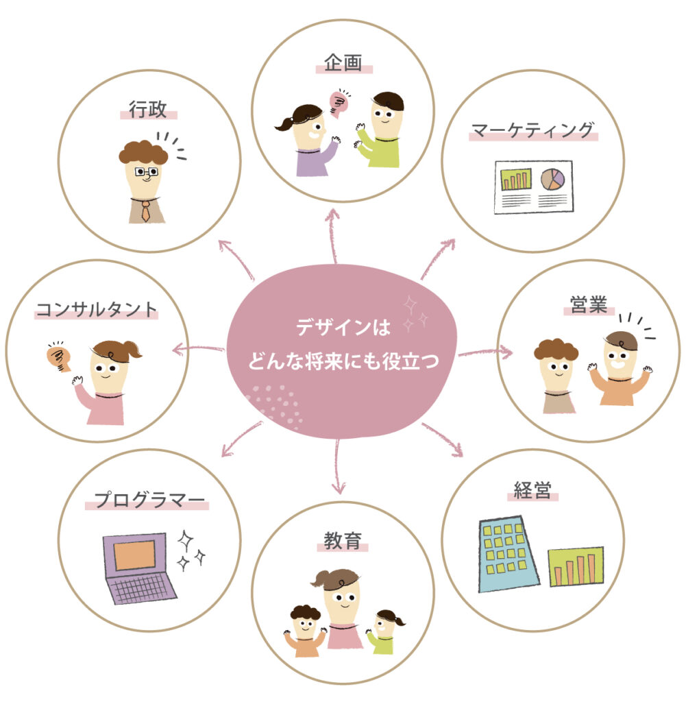 技術はもちろんですが、企画や、考え方、コンセプトの立て方、商品の売り方、実践的に企業と関わりながらプロジェクトを進めたりと、人との関わり方も学んでいきますので、最終的にどんな職に就いてもデザイン思考は役立ちます。