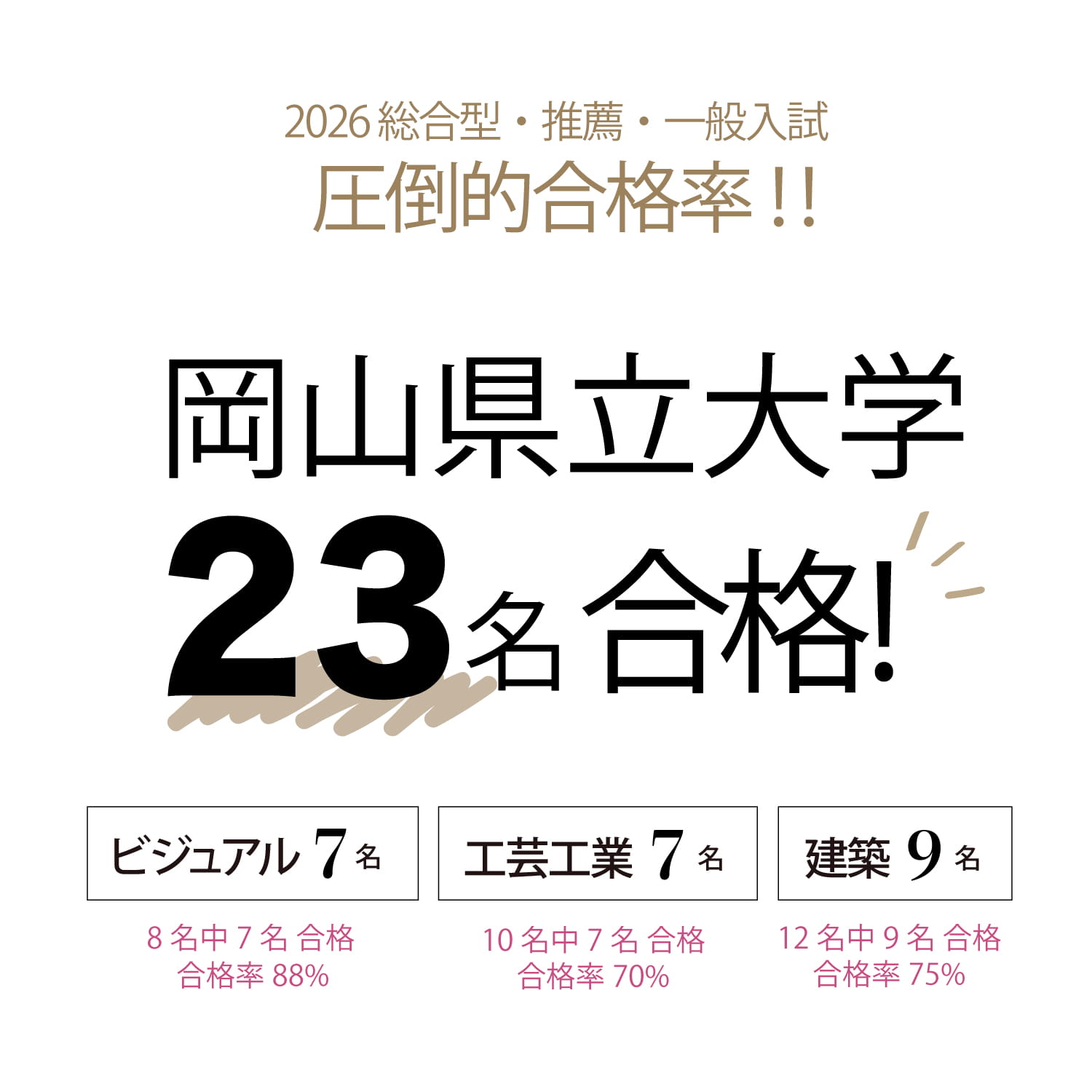 2025年度入学の入試では、推薦と一般の合計18名が合格!(最終確定)。2024年度はなんと一般入試ではビジュアルデザイン学科、工芸工業デザイン学科の合格率は100%でした!! 昨年度と同じく共通テスト得点率4割〜5割の生徒さんたちが実技試験でみごと逆転合格しました! 当アトリエの統計で6ケ月以上通われた方の合格率が高くなっており、受験までの期間が3ケ月を切られてから始められる方へは、短期集中特訓のデッサン指導にも対応しております。また、当アトリエは岡山県立大学建築学科の対策ができる岡山県で唯一の美大予備校です。建築学科を知り尽くした県大現役の学生が丁寧に指導いたします。